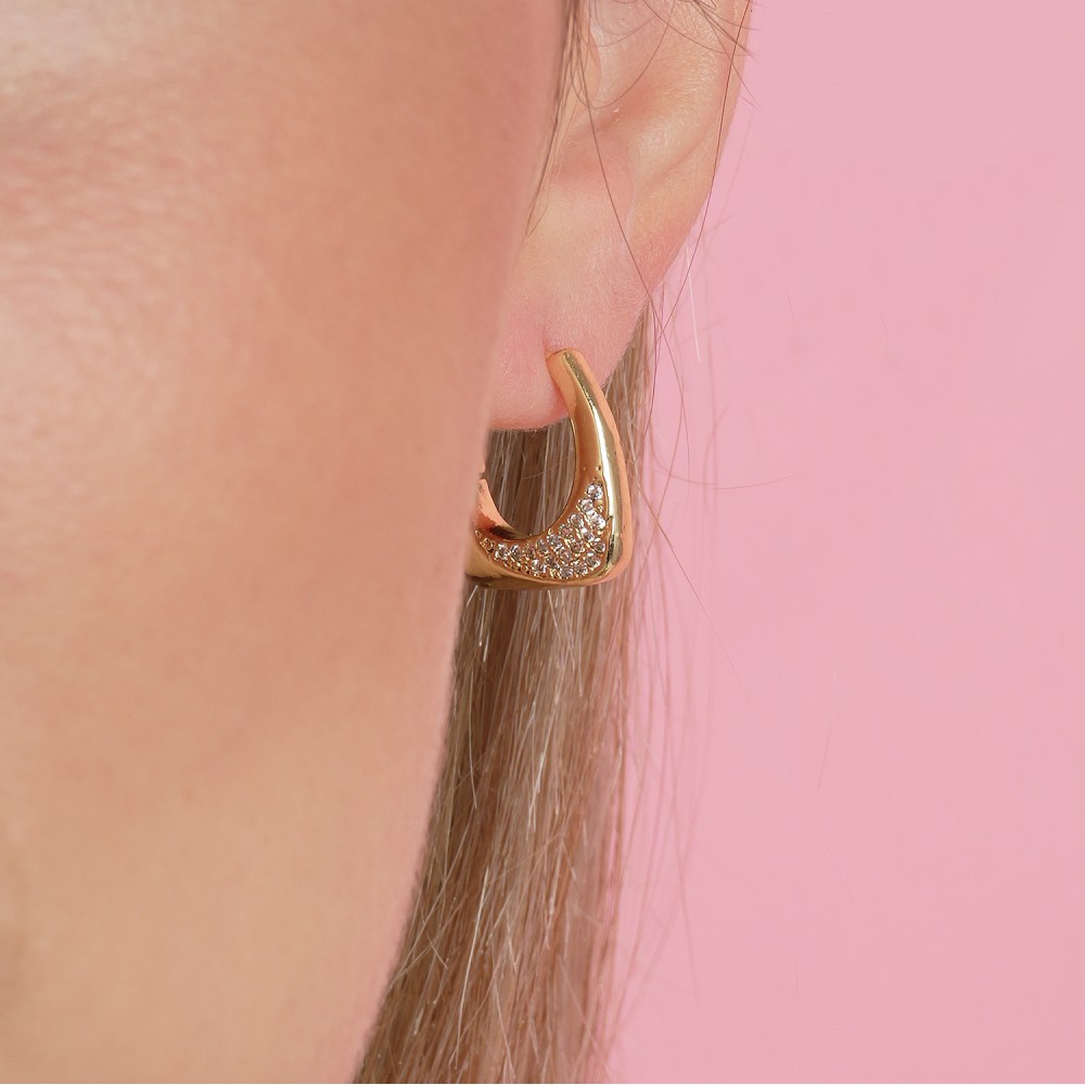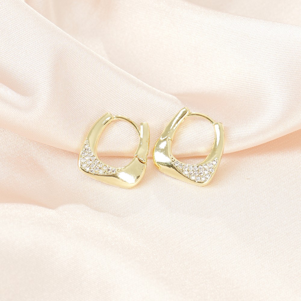 Κομψά σκουλαρίκια σε σχήμα μικρού κύβου με λευκά κρυσταλλάκια, σε χρυσό χρώμα.