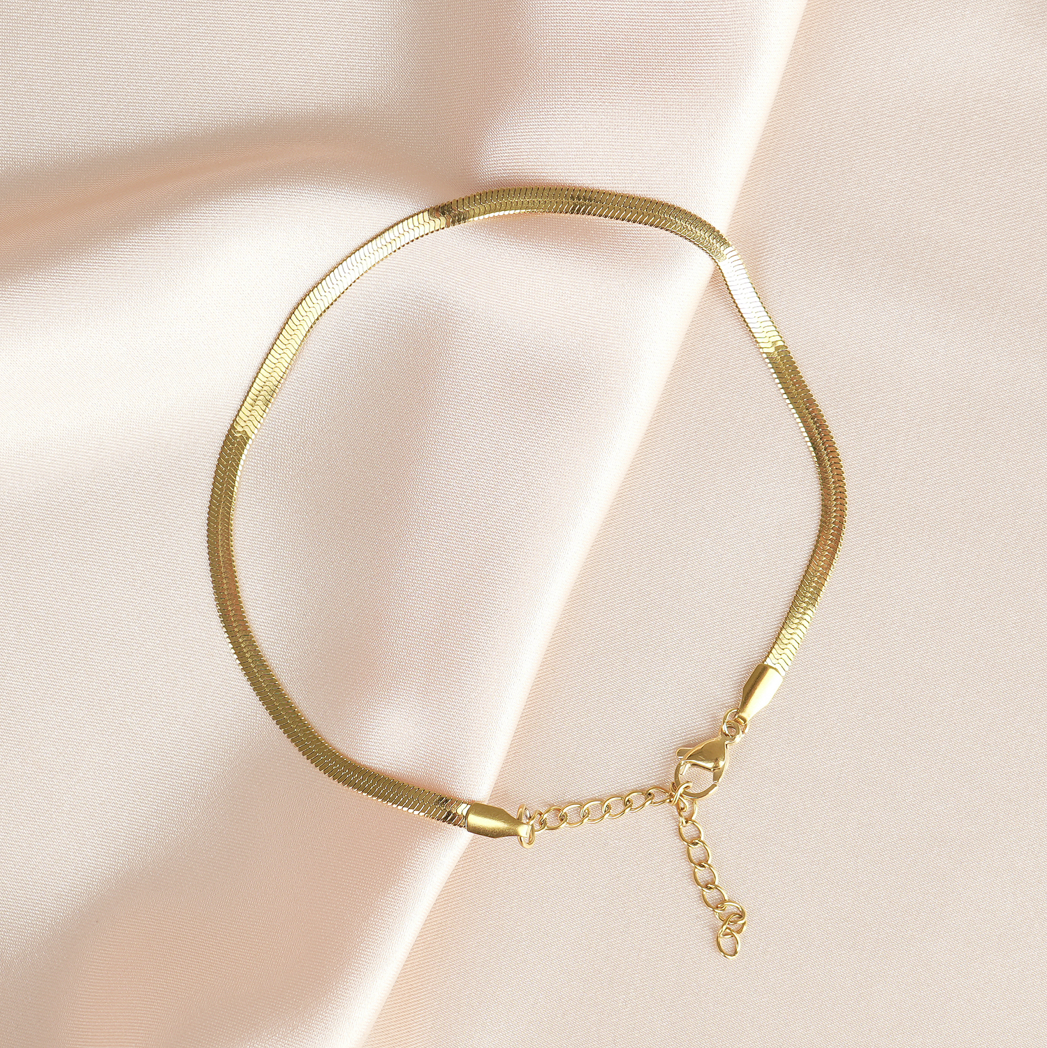 Μοντέρνα αλυσίδα ποδιού της Assim σε χρυσό χρώμα και ίσιο πλακέ σχέδιο, από ανόδειξωτο ατσάλι.