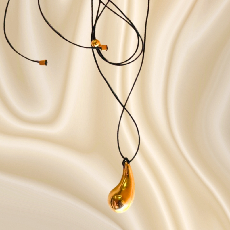Κομψό κολιέ με κορδόνι μαύρο και κρεμαστό σχέδιο δάκρυ σε χρυσό χρώμα, από ανόδειξωτο ατσάλι. Συνδυάζεται εύκολα για να ταιριάζει με κάθε μοντέρνα εμφάνιση.