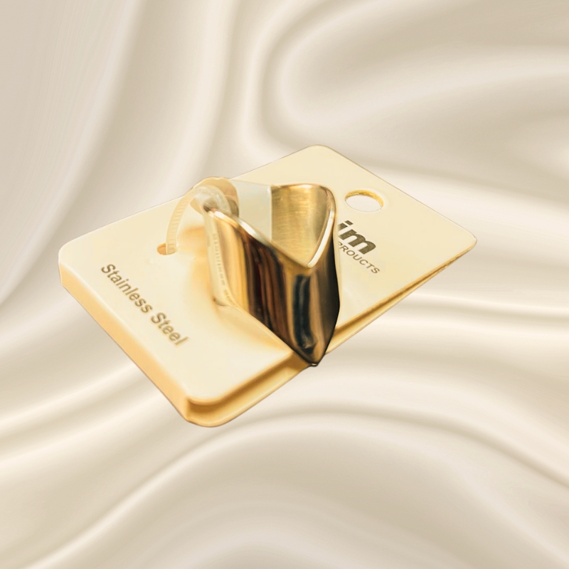 Μοντέρνo γυναικείο, ρυθμιζόμενο δαχτυλίδι της Assim, σε χρυσό χρώμα και σχήμα χοντρού V. Δημοφιλής επιλογή για statement εμφανίσεις, καθώς συνδυάζει τη γεωμετρική αισθητική με την ανθεκτικότητα του ανοξείδωτου ατσαλιού.