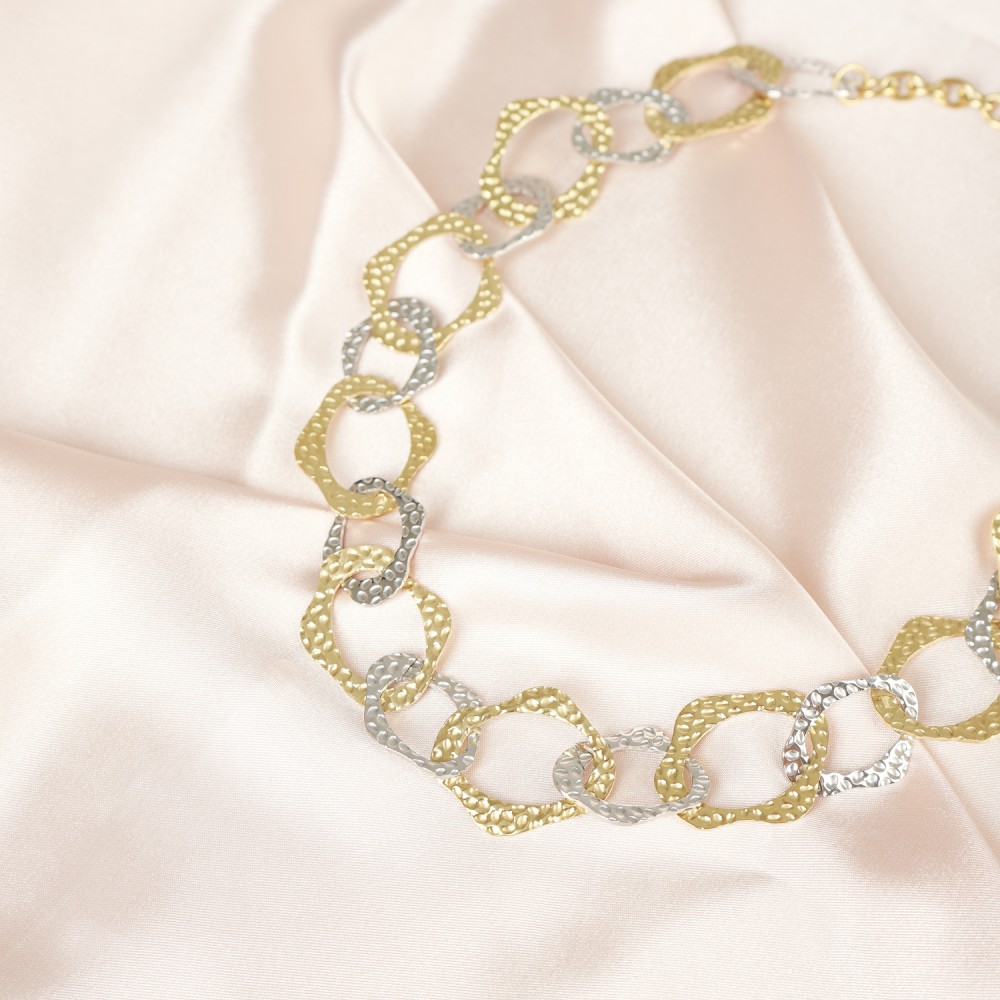 Διαχρονική κομψότητα με το εντυπωσιακό κολιέ που συνδυάζει χρυσό και ασημί χρώμα, από ανόδειξωτο ατσάλι. Ένα υπέροχο σφυρήλατο σχέδιο με ασύμμετρους κύκλους, που δεν πρέπει να λείπει από την συλλογή σας, για ξεχωριστές εμφανίσεις.