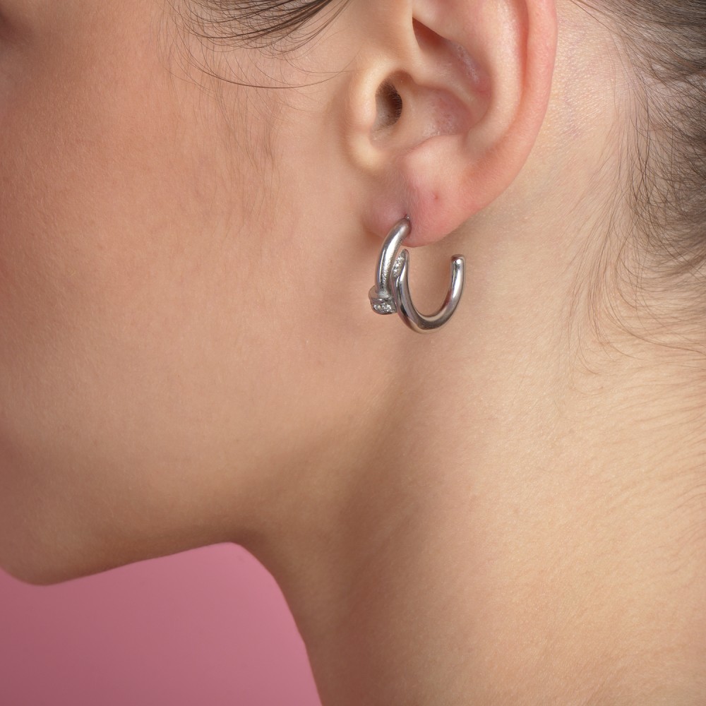 Εκλεπτυσμένα σκουλαρίκια σε ασημί χρώμα με καμπυλωτό σχήμα και μικρές, λευκές πετρούλες, από ανόδειξωτο ατσάλι για διαχρονική κομψότητα.