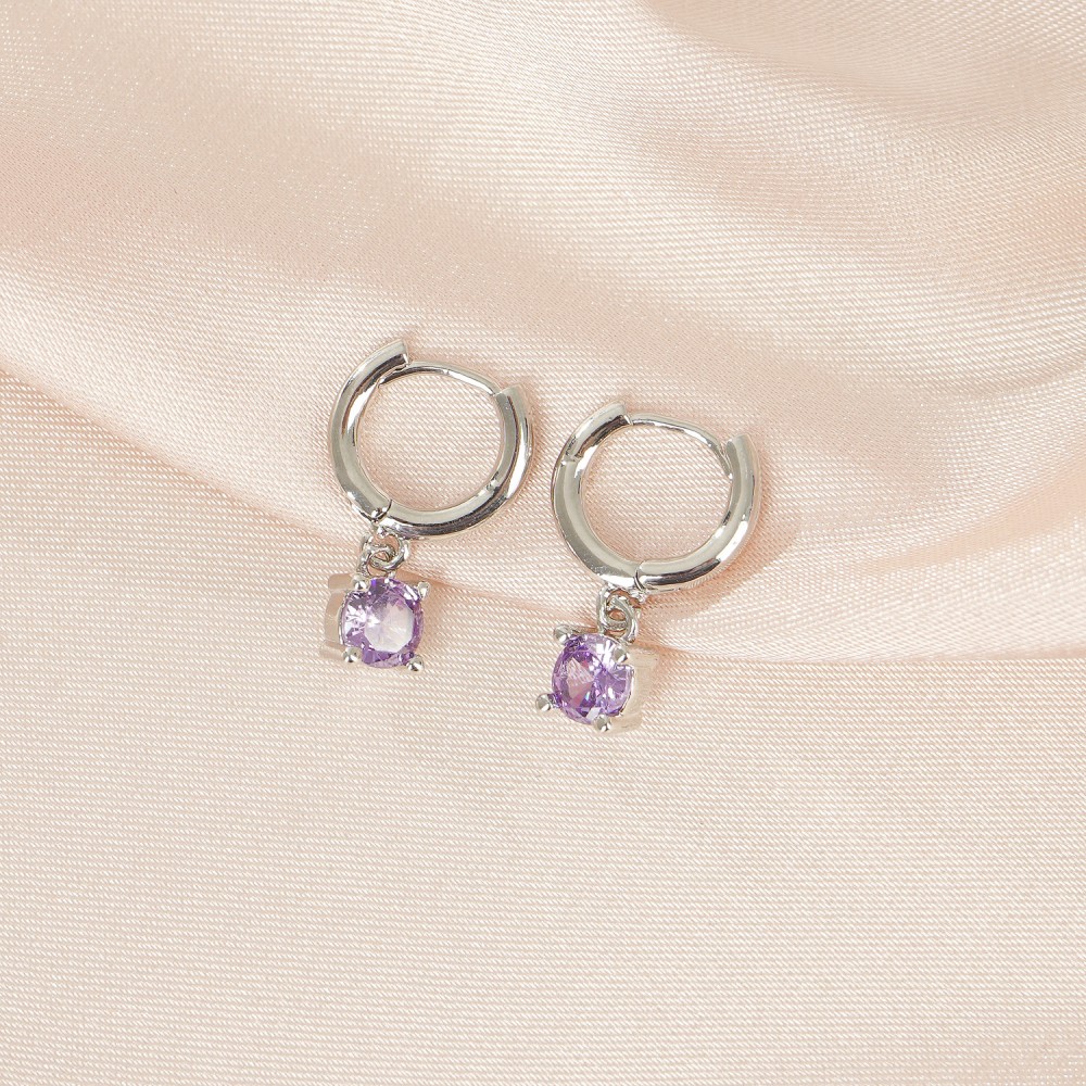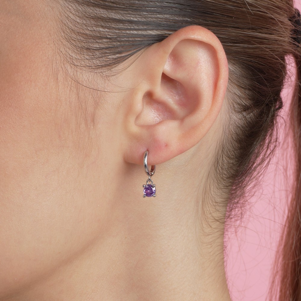 Μοντέρνα σκουλαρίκια σε ασημί χρώμα και σχήμα μικρού κρίκου, διακοσμημένα με κρεμαστή μωβ πέτρα.