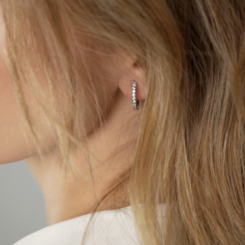 Μοντέρνα σκουλαρίκια σε ασημί χρώμα και σχήμα μικρού κρίκου διακοσμημένο με στρας, για να προσδίδουν κομψότητα και λάμψη, κατασκευασμένα από ανοξείδωτο ατσάλι.