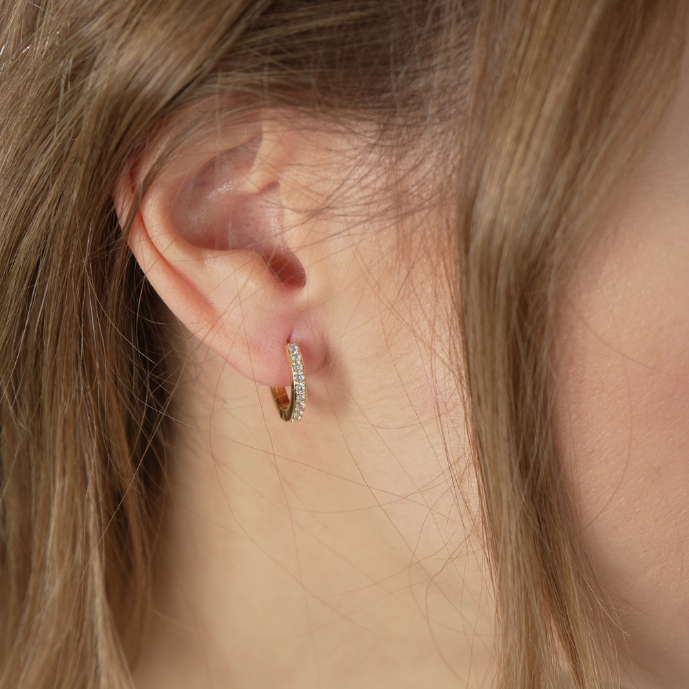 Μοντέρνα σκουλαρίκια σε χρυσό χρώμα και σχήμα μικρού κρίκου διακοσμημένο με στρας, για να προσδίδουν κομψότητα και λάμψη, κατασκευασμένα από ανοξείδωτο ατσάλι.