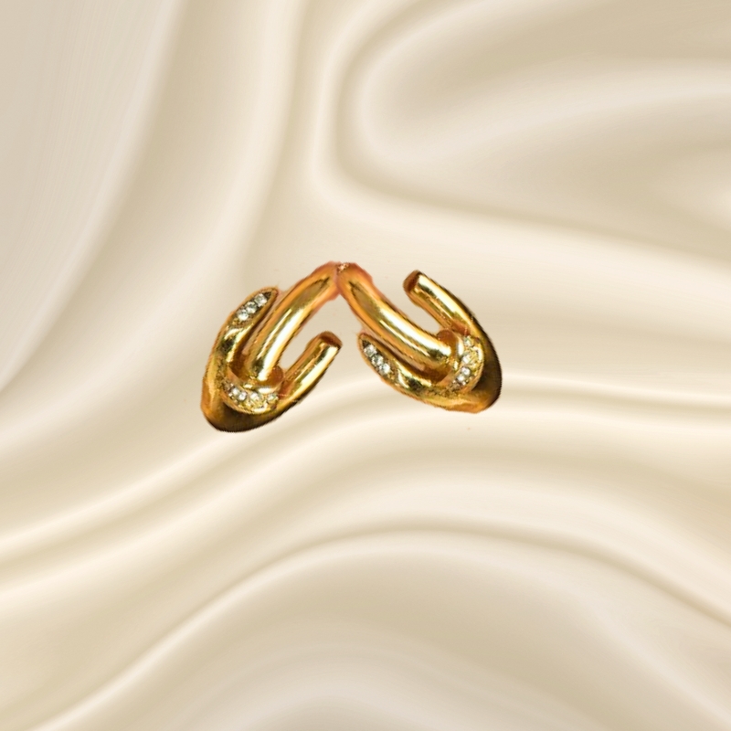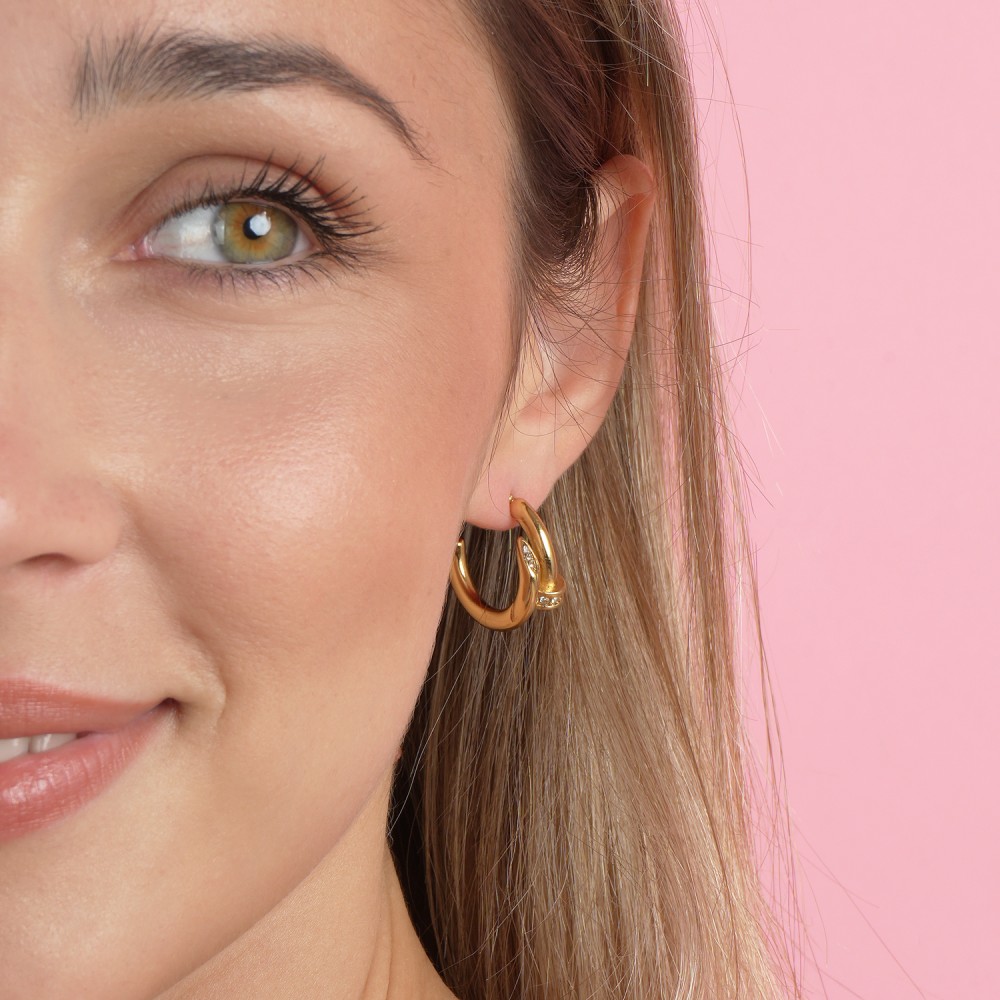 Εκλεπτυσμένα σκουλαρίκια σε χρυσό χρώμα με καμπυλωτό σχήμα και μικρές, λευκές πετρούλες, από ανόδειξωτο ατσάλι για διαχρονική κομψότητα.